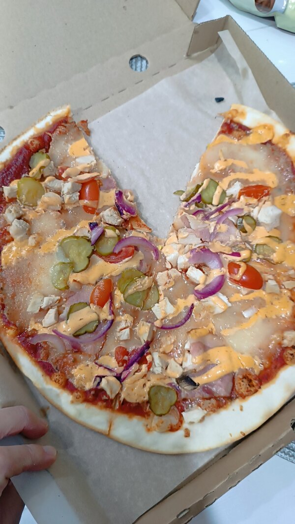 Доставка была не долгой. Отменный вкус и тесто, а сама пицца была горячей!