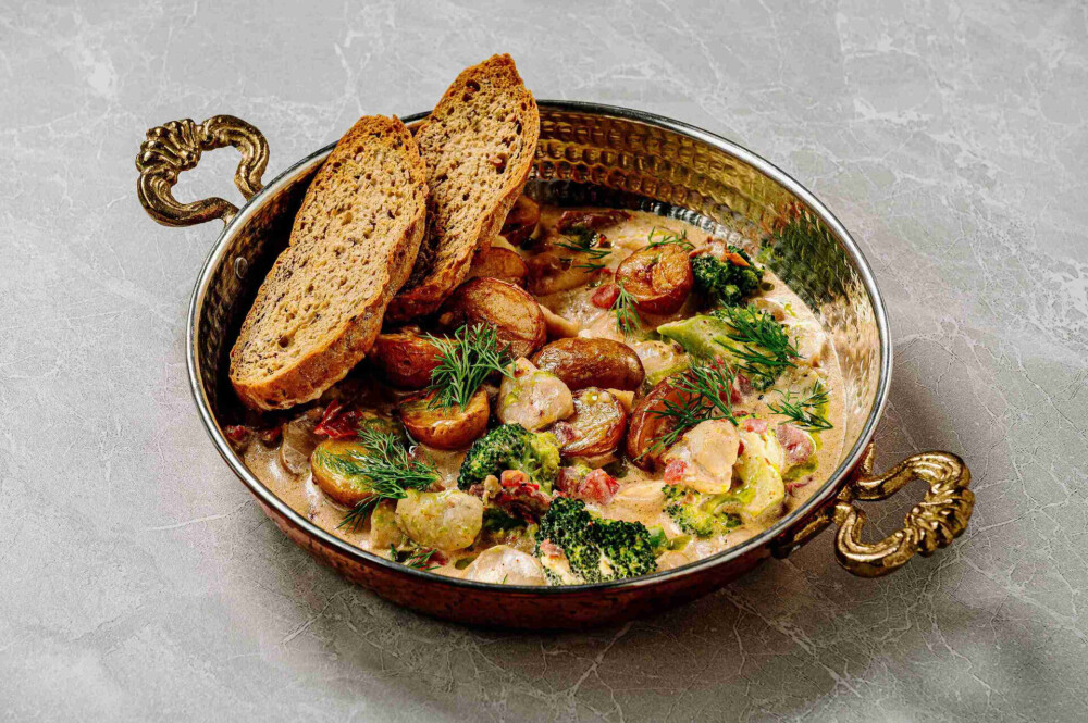 Обжаренная говяжья вырезка с вешанками и луком пореем, притушенная в сливках, с гарниром из картофельного пюре. Украшается свежей зеленью.