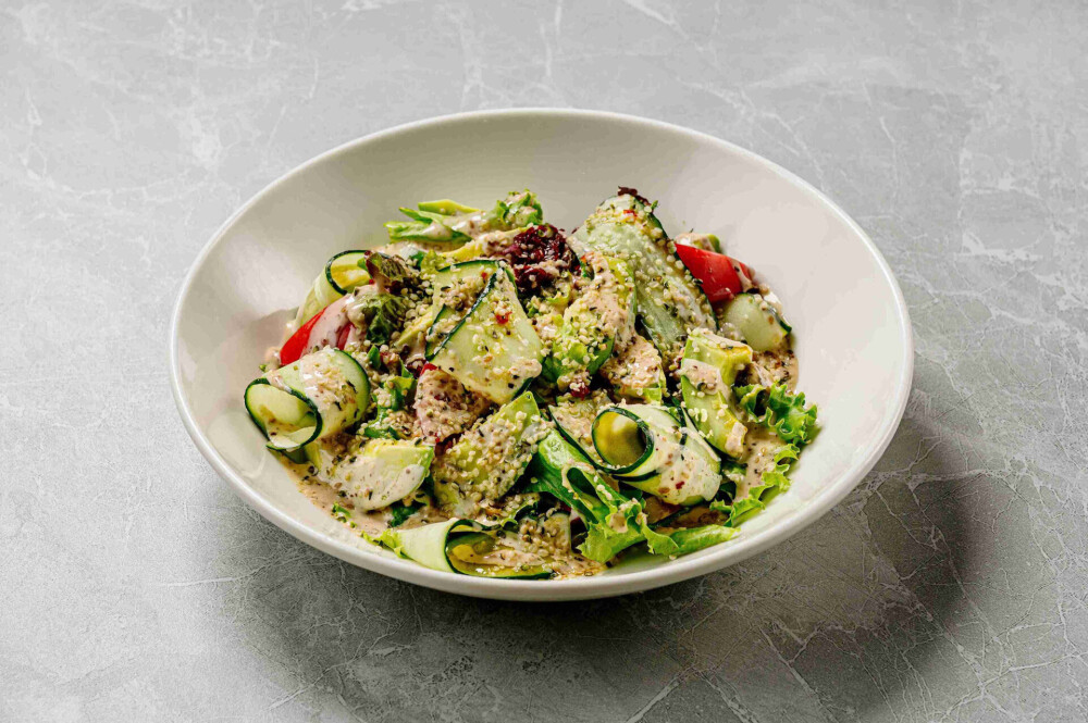 Судак на подушке из кабачка с помидорами, брокколи, луком порей, чесноком. Заправка: майонез, сметана, сыр. Украшается зеленью.