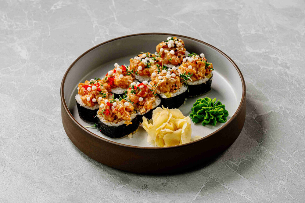 Семга, снежный краб, соус спайси, сыр буко. Украшаем устричным соусом и кунжутом.