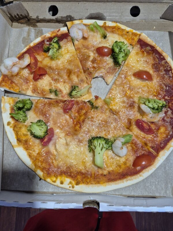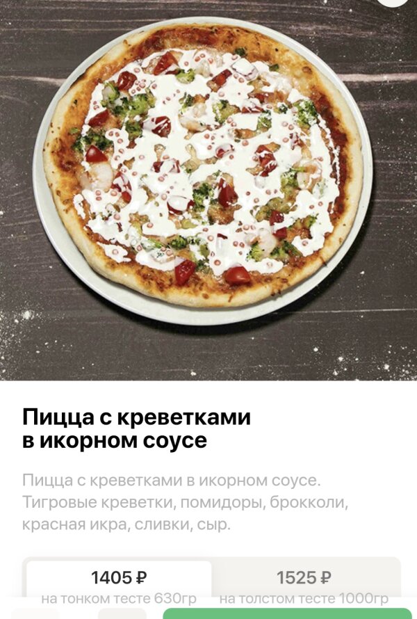 Очень разочарована пиццей. Фото на сайте и в реальности явно не совпадают. 4 креветки, несколько брокколи и несколько штучек помидорок за 1405 рублей - не слишком ли? К соусу претензий нет