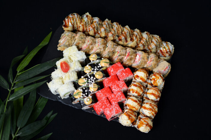 Тибури с угрем, хекура с лососем, киото с креветкой, цезарь, нидзё с лососем, калифорния с креветкой