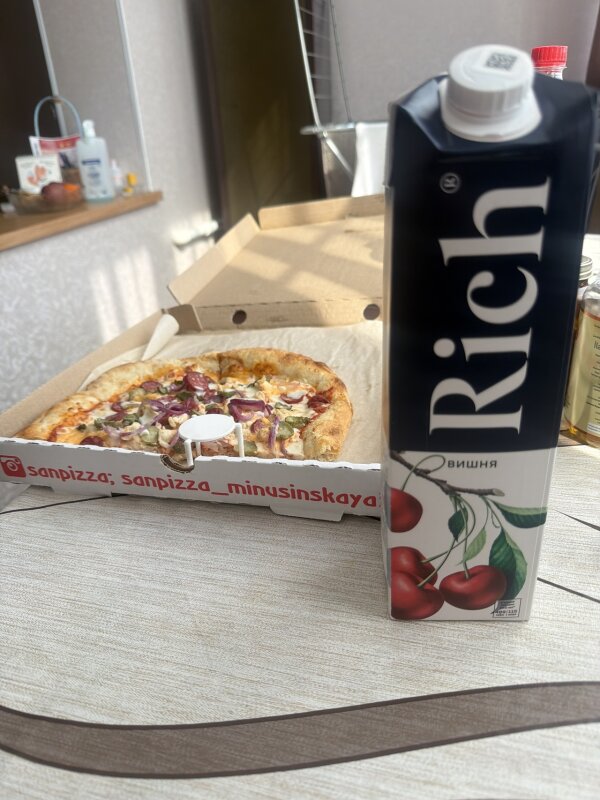 Часто заказываем в СанПицце, нарекании ранее не было ни к доставке, ни к еде. За исключением вчерашнего заказа 14.03.26 заказали пиццу, два бургера, сок Rich вишневый, к еде вопросов нет, однако при распаковке заказа оказалось, что бутылка с соком была уже открытой 🤦🏼♀️ минус и не приятный. Собственно вопрос к его свежести и зачем собственно было открывать сок???